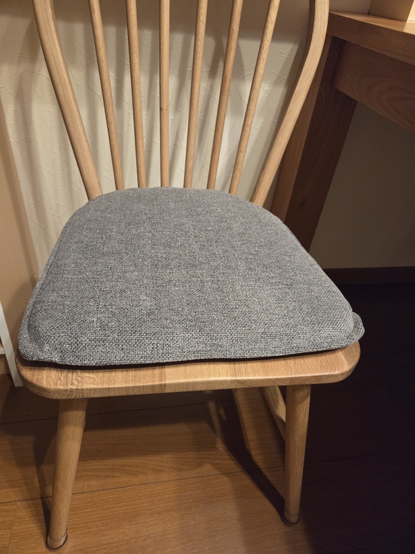 オプションで購入できるシートクッションも嬉しいです。ナチュラルカラーのチェアに、クッションの色は迷いましたがグレーにしました。