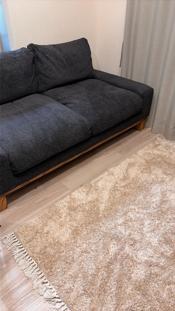 プレイマットにするか迷ったのですが、他のインテリアの雰囲気と合わせてラグで。