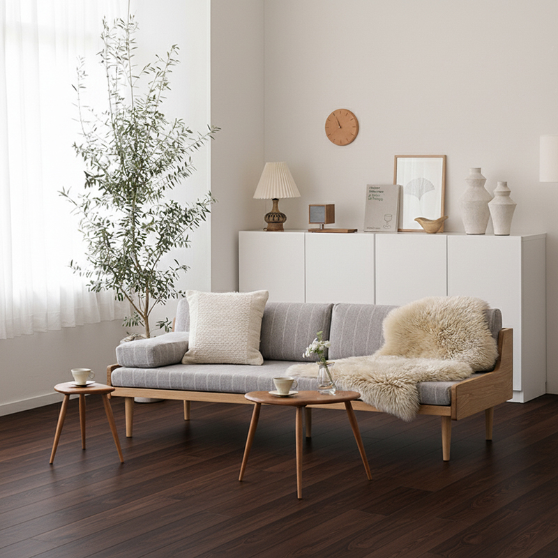 たとえば、ダークブラウンの床に明るい家具を置くと、