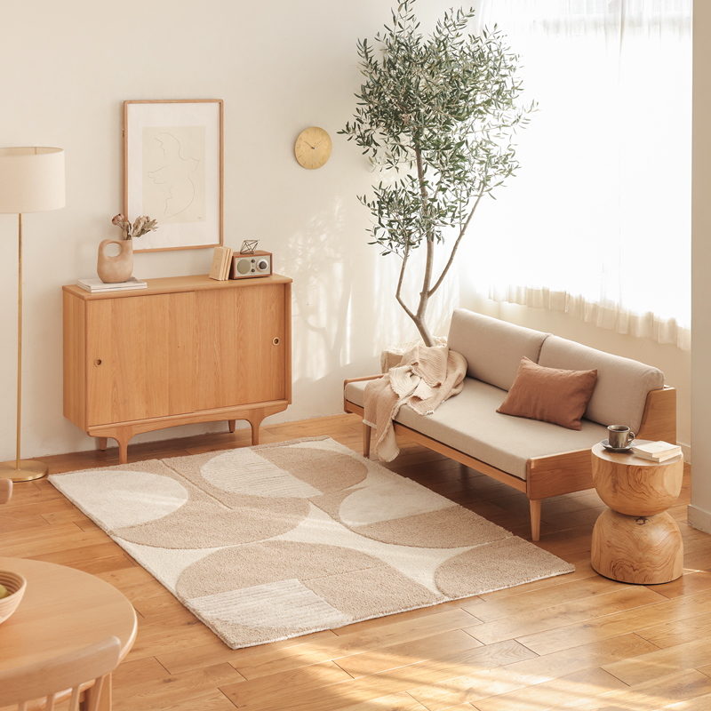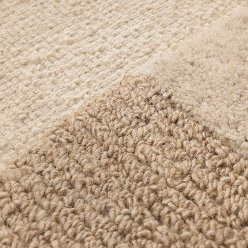 ウールならではのベージュ・ブラウンの淡い色味が、白い壁や木製フローリングに調和し、お部屋に統一感をもたらします。