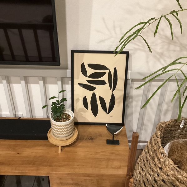 ブランケットや小物を緑で揃えているため、緑の絵画が欲しく、シンプルでありながら味のあるスタイルを気に入りました。