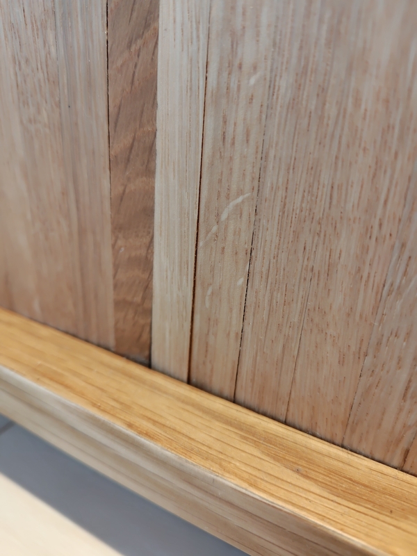 (また、設置してしばらくして扉中央下部に隙間が生じ、左右の木部が手前に反って段差が目立つ状態になりました。見た目が気になりますが、これは乾燥によるものとのことです。)