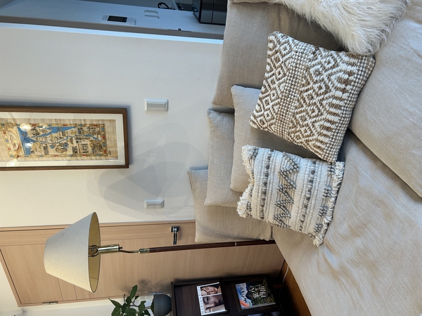 AGRAソファのリネン生地はシンプルなのでこのクッションを置くとアクセントになりよりかわいくなりました。カバーの生地は肌に触れると少しチクチクするので私はこちらは実用性よりも完全にインテリアとして使用しています。