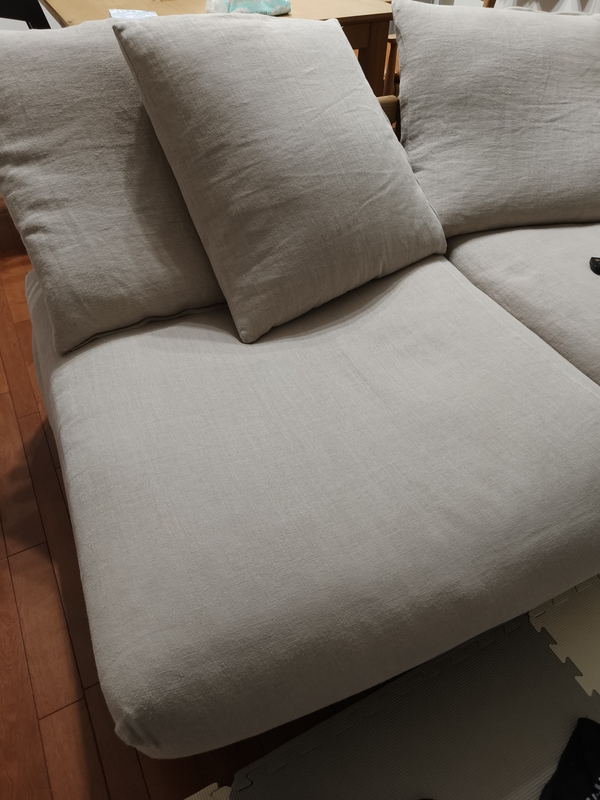 座面と背面のクッションカバーの取り外しや洗濯などもそんなに重労働にはならなそうで、これから長くお付き合いしたいソファです。