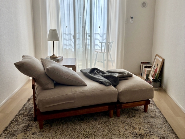 カウチと迷ったのですが、壁際に設置したので、フレームで囲まれる形にできるこちらにして正解でした。