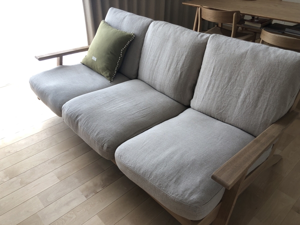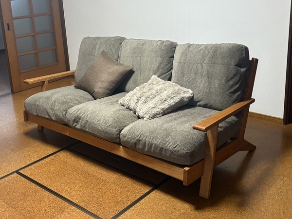 以前から木のフレームのソファがいいなぁと主人が言っていて、ネットで何気なく探していた時に出会いました。