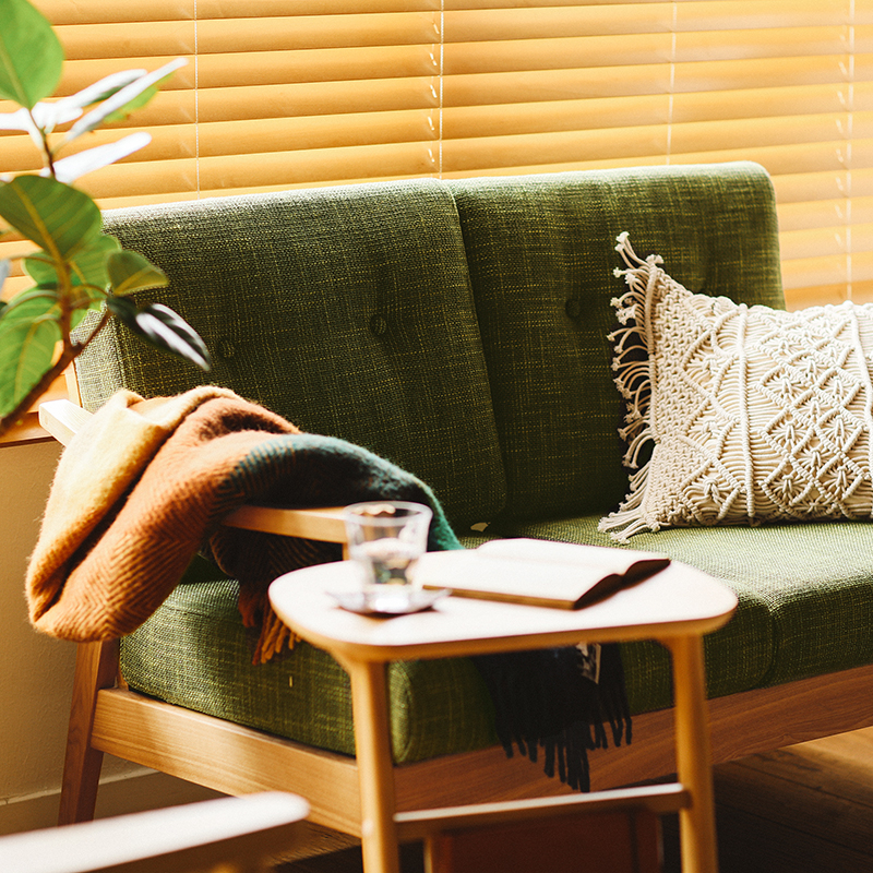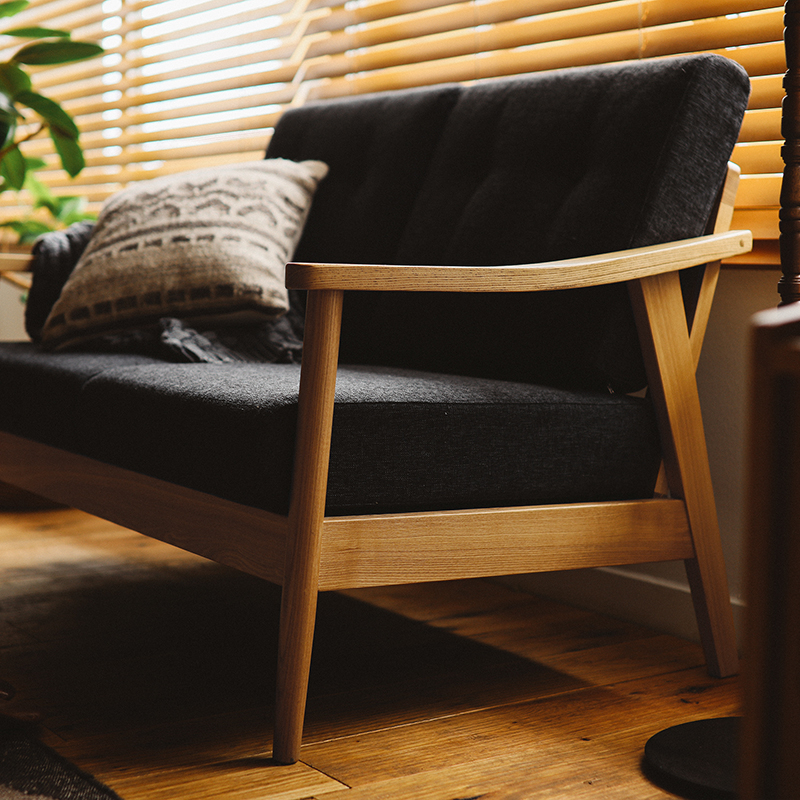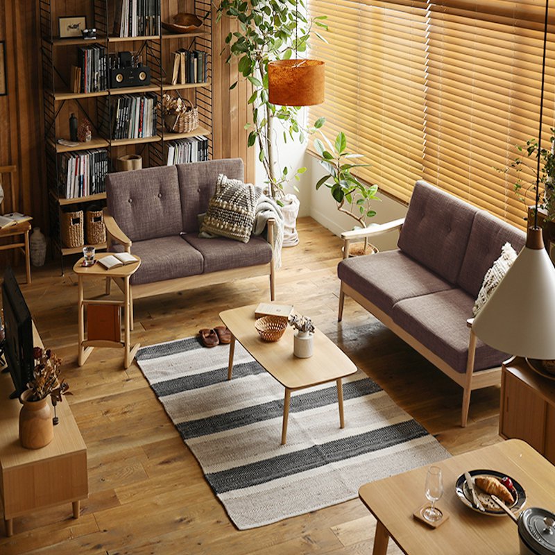 木製フレームと優しい色合いのファブリックで、温もりのある空間を作り出します。ワンルームに置きやすいサイズ感ながらも、しっかりとくつろげる2人掛けタイプです。