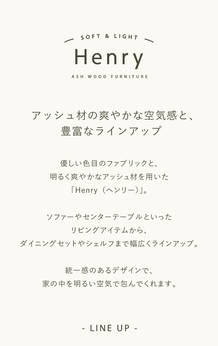 優しい色目のファブリックと、美しい木目のアッシュ材を用いた、シンプルで温もりを感じられる「Henry」シリーズ。