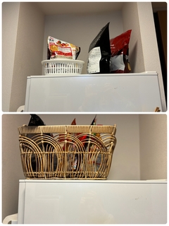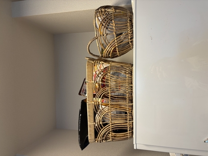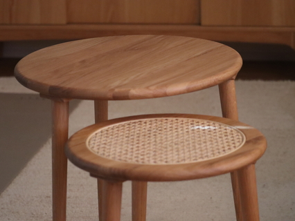 ラタンのアクセントがさりげなくおしゃれです。いつもコーヒーカップを置いて楽しんでいます。