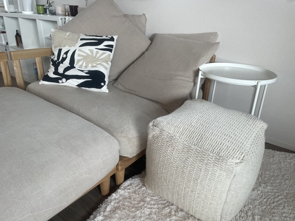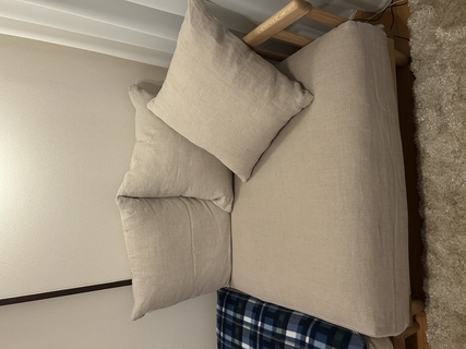 最初に1.5人がけが届き、こちらのコーナーソファは予約購入になり少し遅れて届きました。やっぱりコーナーがある方がクッションが横から落ちないので安心してゆったり座れます。子どものお昼寝にもちょうど良い大きさでリネンの生地も気持ちよく満足です。