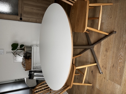 一人暮らしですが、たまに子供達が集まるので少し大きめのテーブルが欲しかったのですが、少しでもスッキリ見えるよう白の天板にしました。