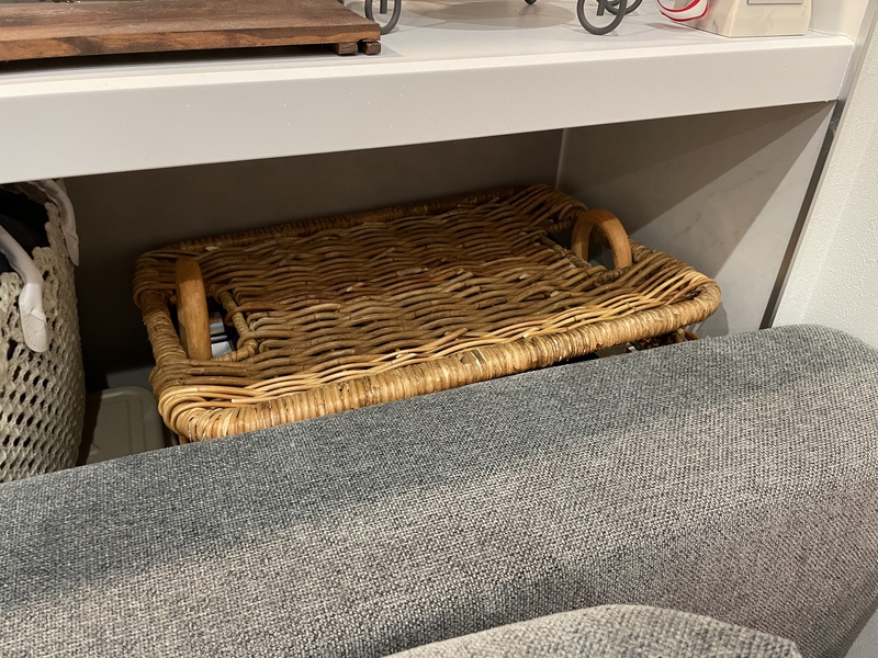 これだけの物量を収めておける大きさなのに、ストックバスケットがお部屋に馴染んでいるのは、「ラタン(籐)」という天然素材を使っているから。塗装はしておらず、ラタン本来が持つ色味や自然にできたムラが、暖かみのある表情を作り出しています。
