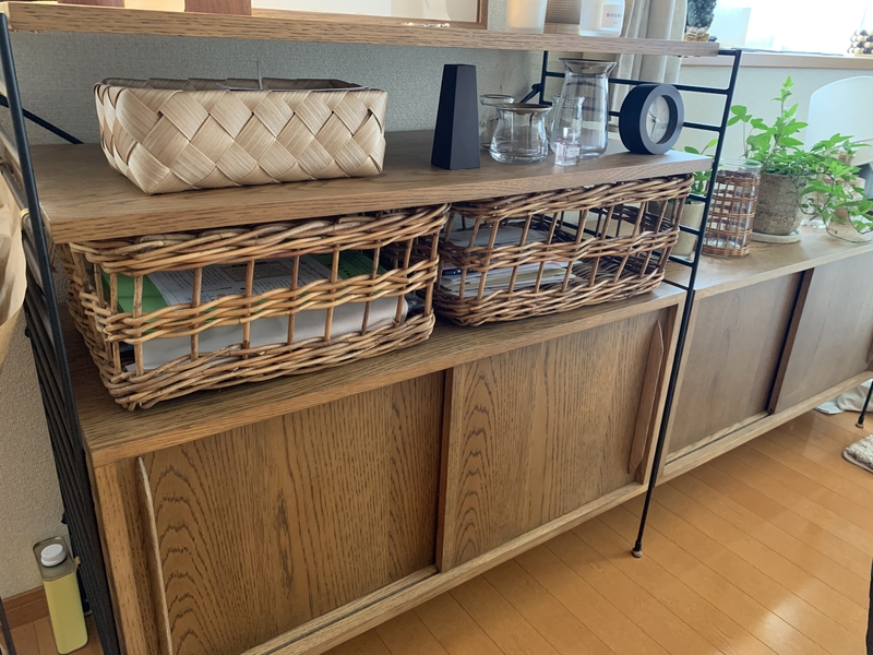 キッチンでは雑多になりがちなストック品を、ダイニングでは生活感が出やすいうえに、かさばる書類を収納するなど、あらゆるシーンで活躍。軽いのもラタンの魅力で、サッとすぐに取り出すこともできて便利です。