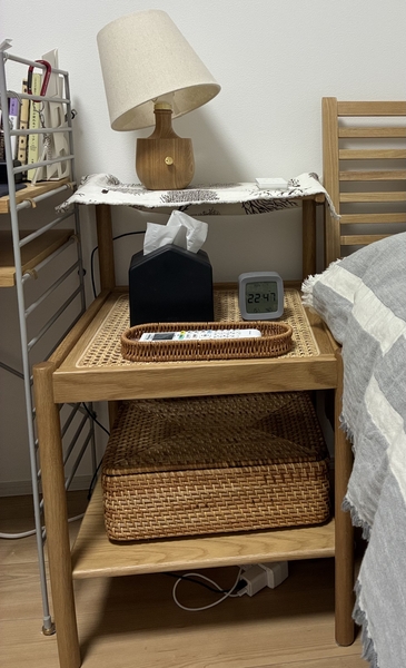 上段・中段・下段の収納が使いやすく、ベッド周りのごちゃごちゃがしっかり片付きました。