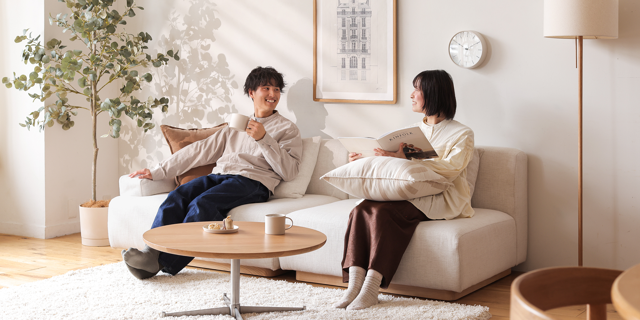 アイボリーのような無彩色のソファーは、「ソファー上のスタイリング」が美しく映えます。