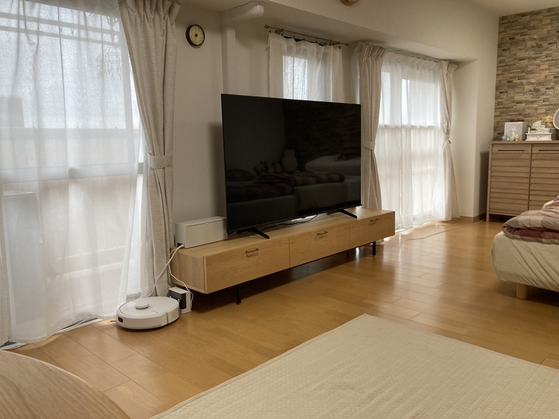 心配事は横幅のある家具を置くことによる圧迫感だったのですが、リセノさんのボードは奥行きが最新のテレビに合わせて作られていたので、一か八かで購入しました。