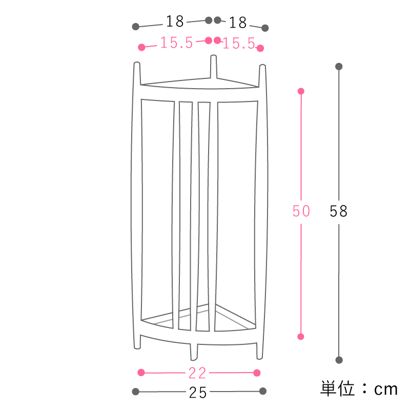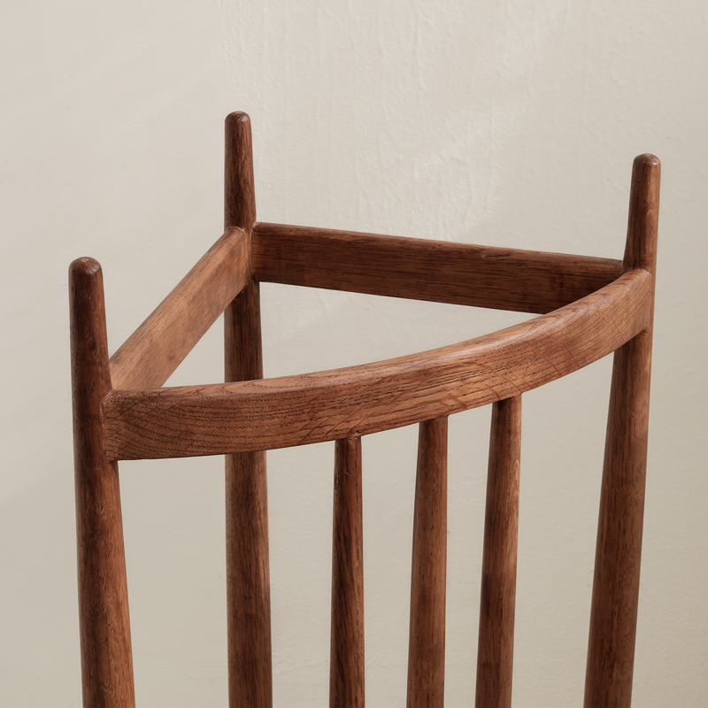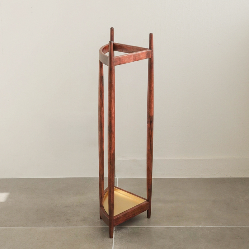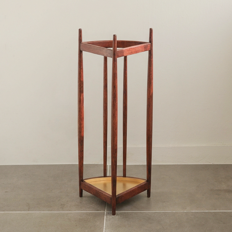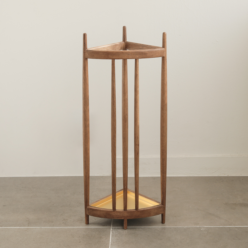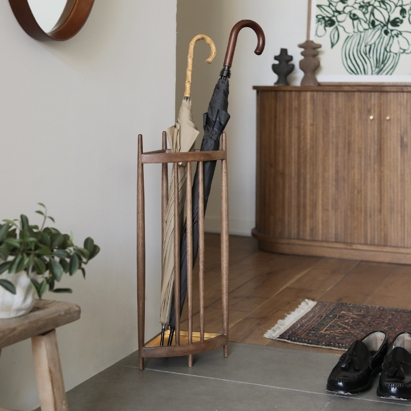三角形の軽やかな木枠に傘を「飾るように置く」ことで、この傘立ては完成します。