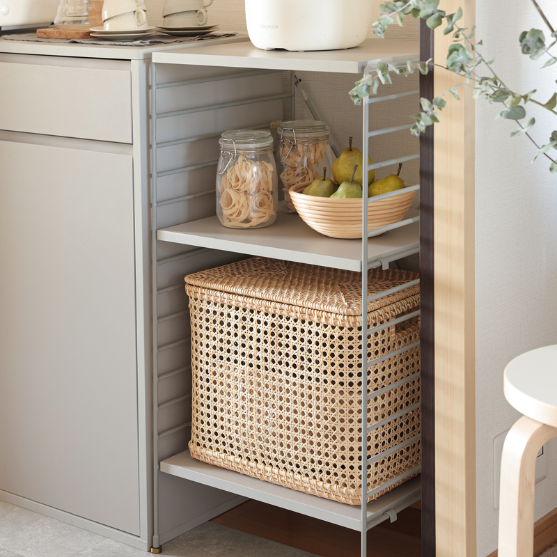 開き戸タイプで収納量が多いラタンキャビネット。 棚板で仕切れるので、食器や食料品のストックなど、細かく仕分けて収納するのに便利です。 床置きができるので、単体で使えるというのもポイント。ラタンを使った意匠も魅力的です。