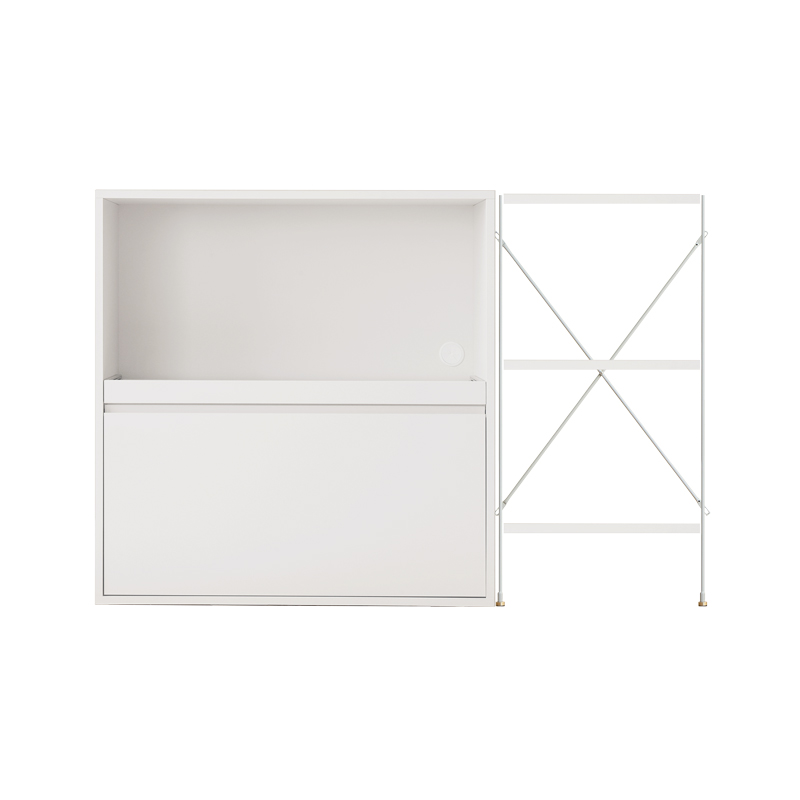 マットな質感でオーク突板材の風合いとも相性がよく、シェルフ全体に高級感を感じさせます。カラーはホワイト、グレー、ブラックの3色展開です。