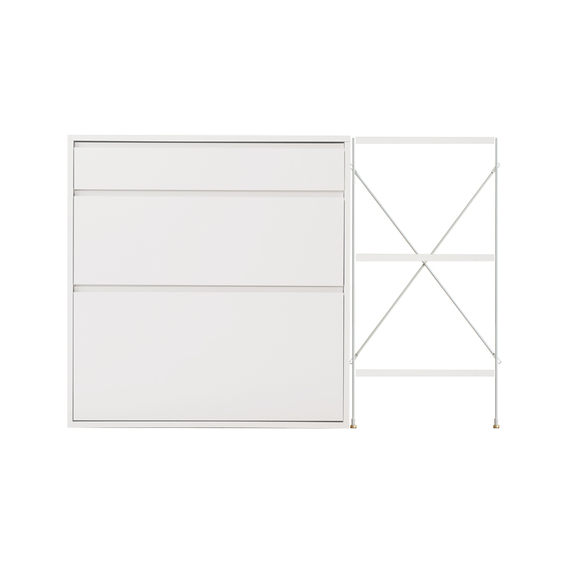 上から順番に深さ違いの引き出しを備えている3段ドロワー。 小さな物から大きな物まで入れることができ、リビングや寝室では洋服ダンスとして、 キッチンでは、カトラリーからお皿や鍋までしまえるキッチン収納としてお使いいただけます。