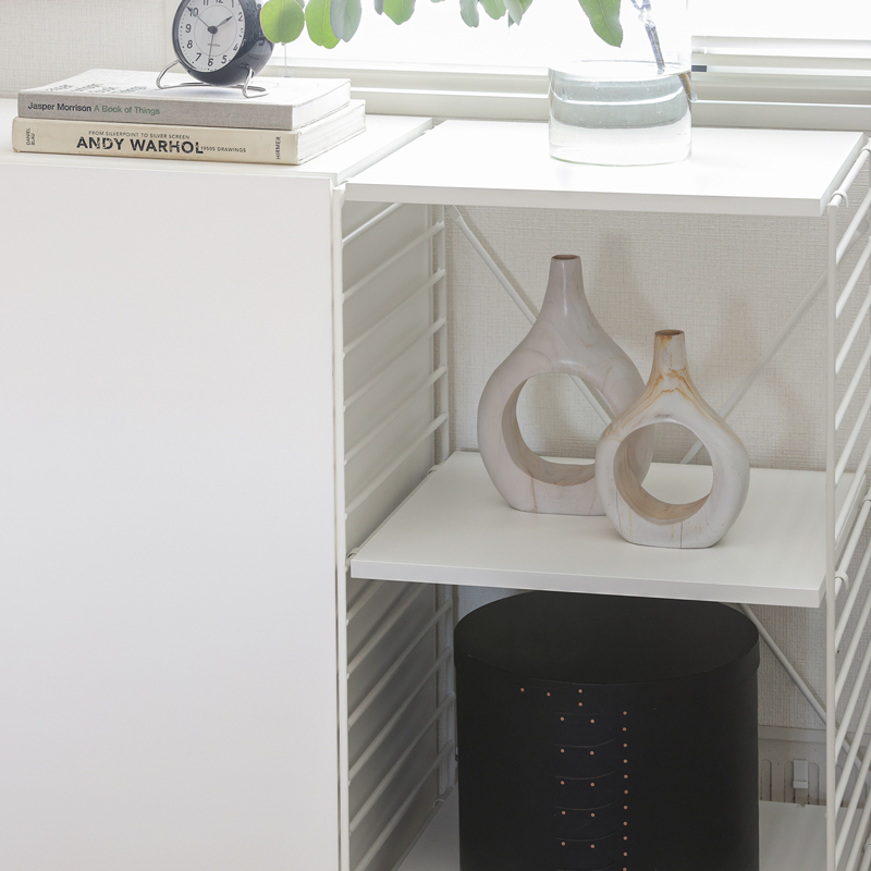 マットな質感でオーク突板材の風合いとも相性がよく、シェルフ全体に高級感を感じさせます。カラーはホワイト、グレー、ブラックの3色展開です。