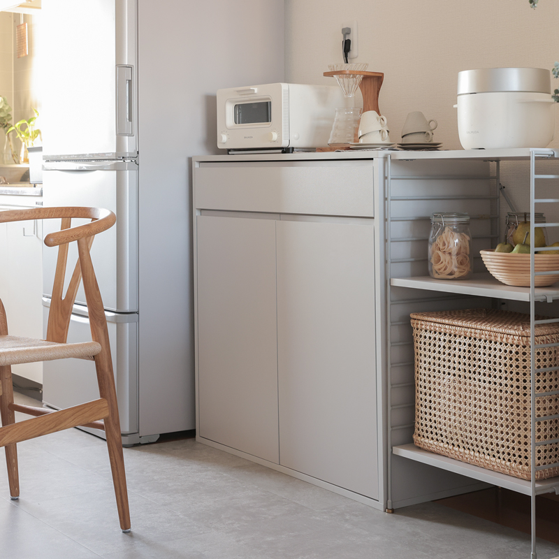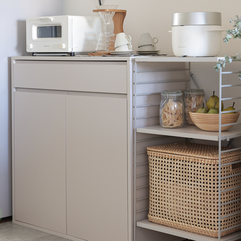 上段に、スライドして引き出せる棚を取り入れたスライド棚付ドロワー。 炊飯ジャーやケトルなどを置いて、使うときだけさっと手前に動かせる便利な収納です。 ウレタン塗装で水にも強いため、天面でちょっとした調理をすることも可能。
