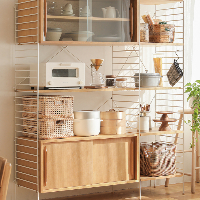 棚板で仕切れるので、食器や食料品のストックなど、細かく仕分けて収納するのに便利です。