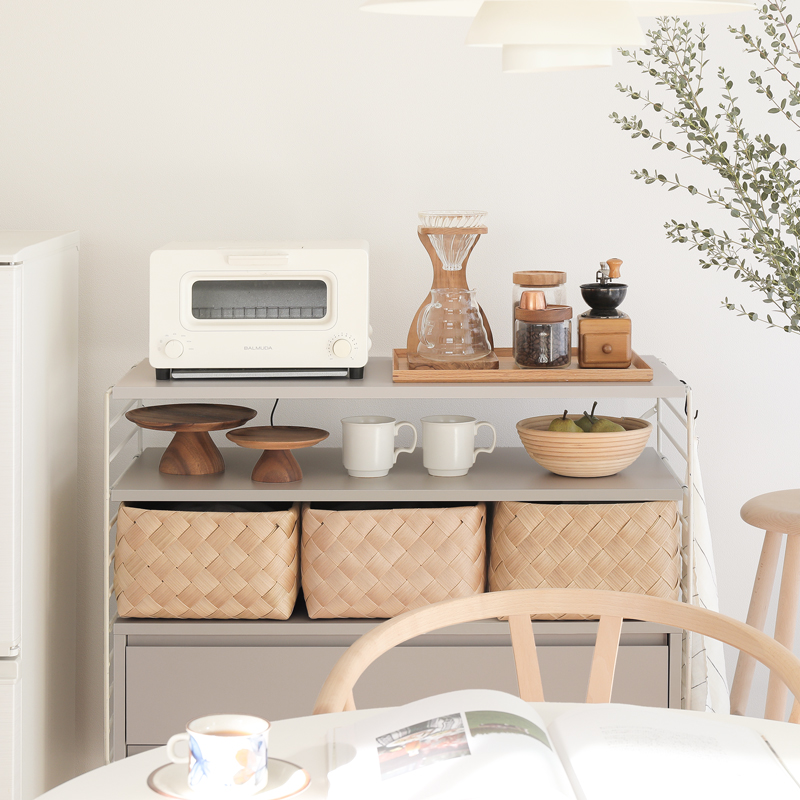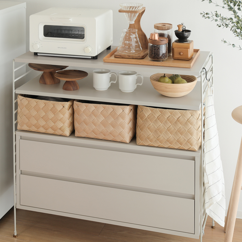 上段に、スライドして引き出せる棚を取り入れたスライド棚付ドロワー。 炊飯ジャーやケトルなどを置いて、使うときだけさっと手前に動かせる便利な収納です。 ウレタン塗装で水にも強いため、天面でちょっとした調理をすることも可能。
