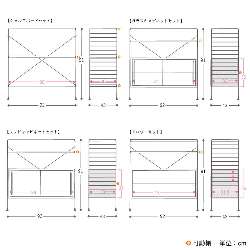 細かく仕切ったり、狭い場所にも便利な44cmタイプ、少しの隙間にフィットする22cmタイプの3種類から選べます。
