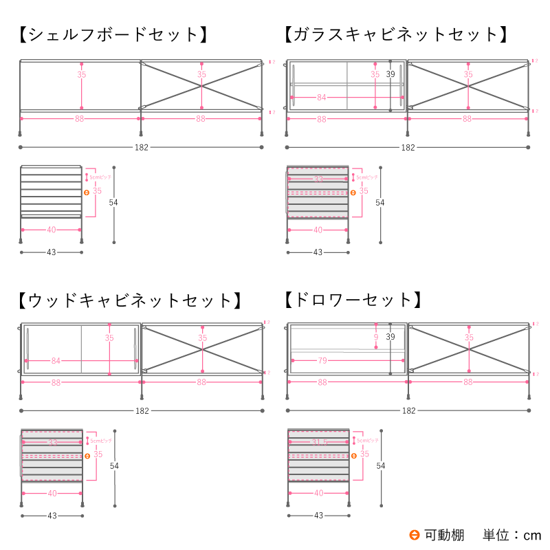 背の高い物から背の低い物までぴったり収められるよう、アイアンフレームのピッチは5cm刻みに設定。