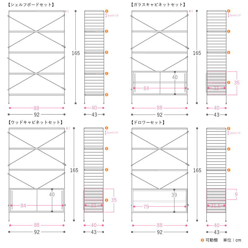 背の高い物から背の低い物までぴったり収められるよう、アイアンフレームのピッチは5cm刻みに設定。