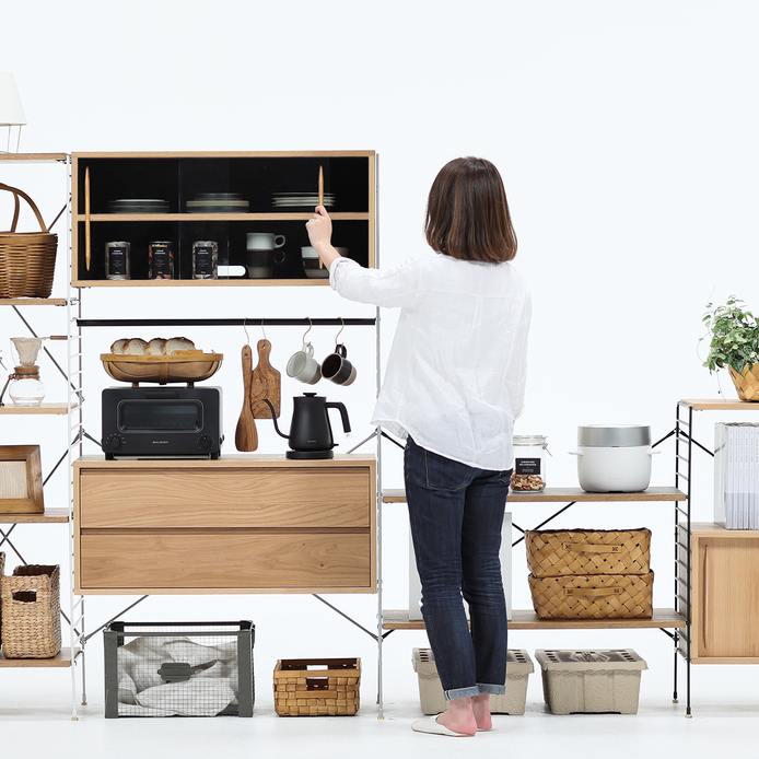棚板で仕切れるので、食器や食料品のストックなど、細かく仕分けて収納するのに便利です。