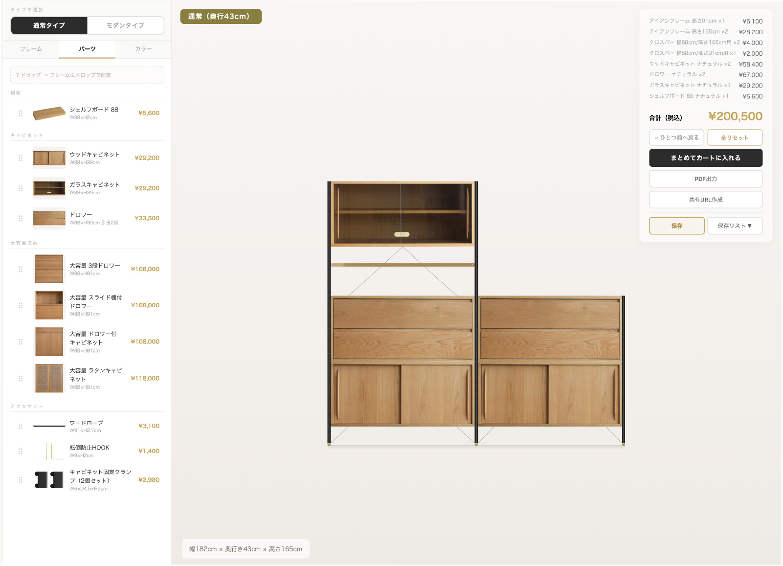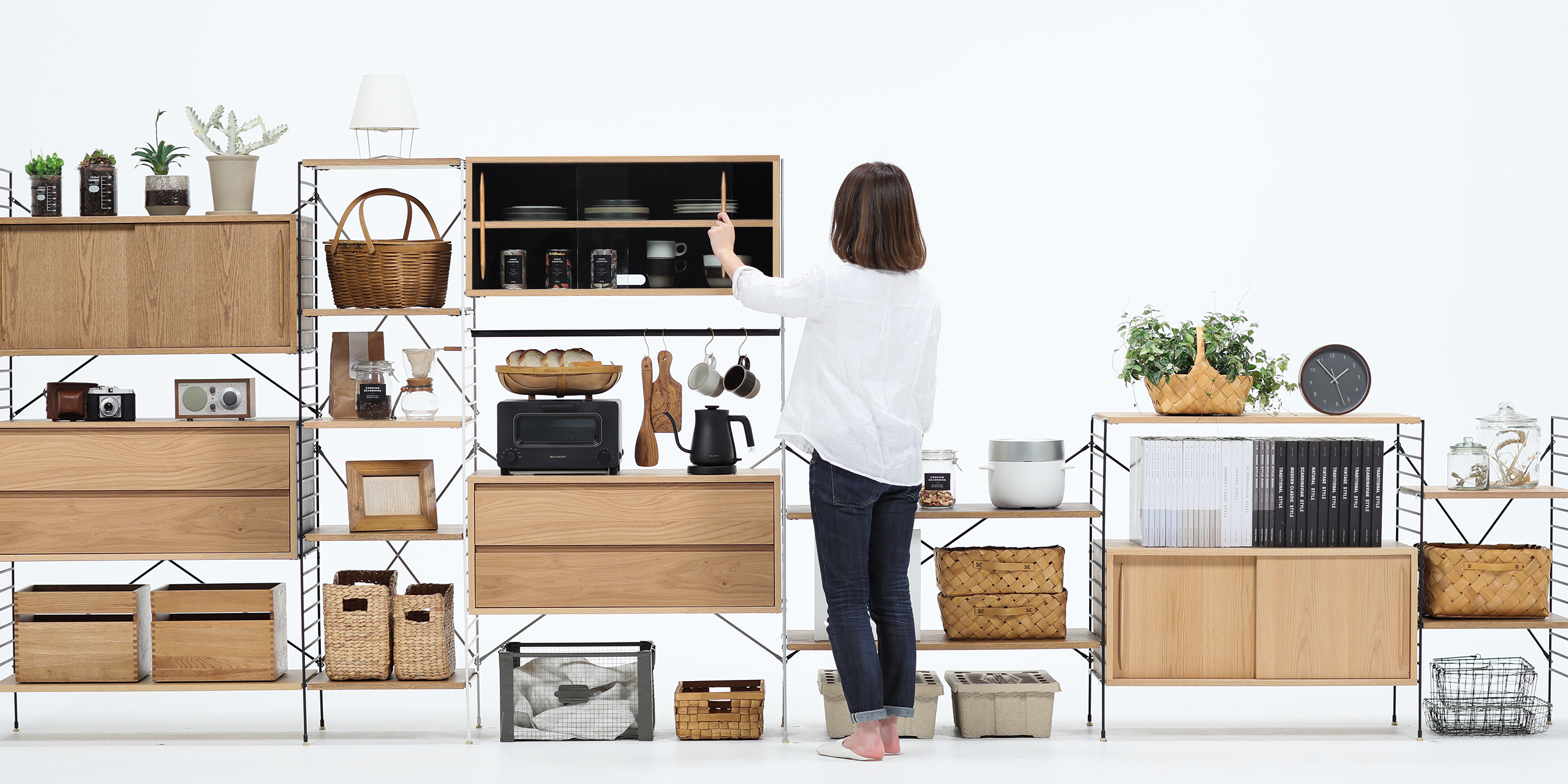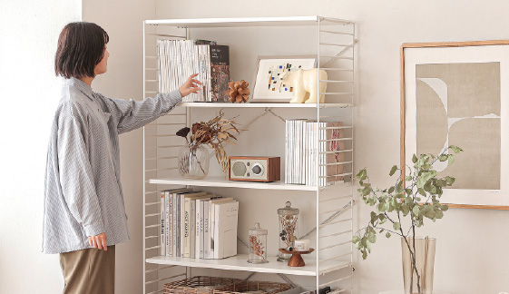 壁面を覆う大型のブックシェルフから、コンパクトなシェルフやTVボードまで、使う場所に合わせた様々な組み合わせが可能です。