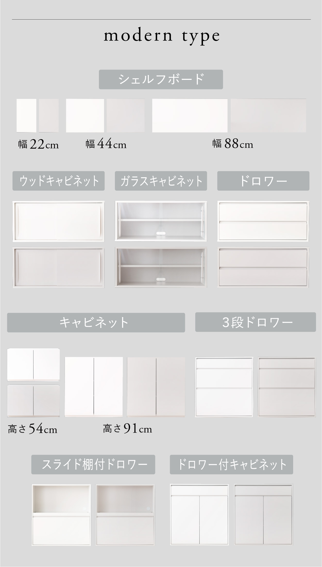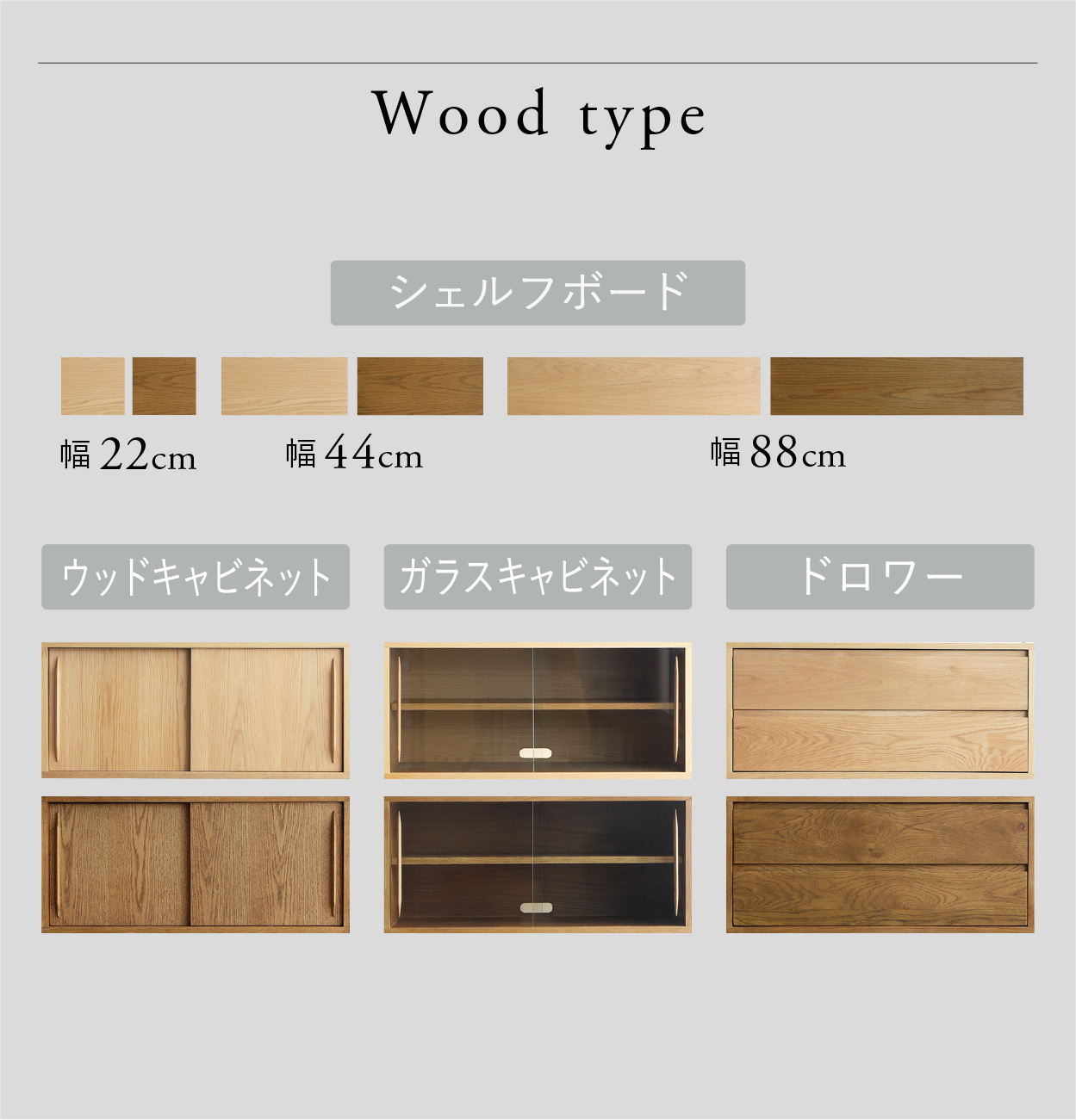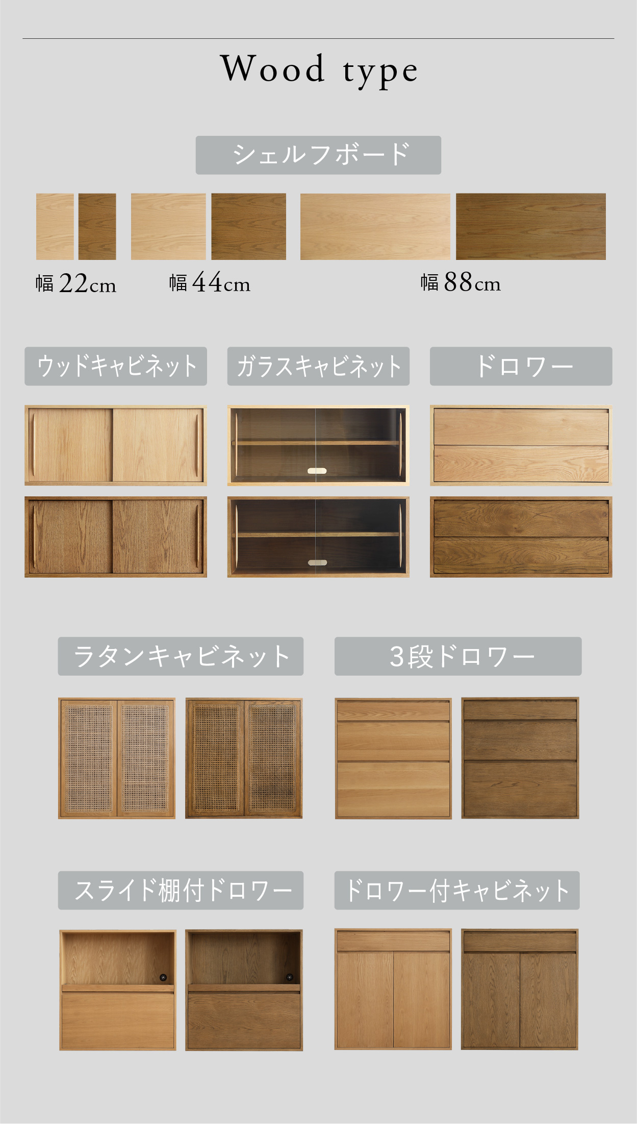 マットな質感でオーク突板材の風合いとも相性がよく、シェルフ全体に高級感を感じさせます。カラーはホワイト、グレー、ブラックの3色展開です。