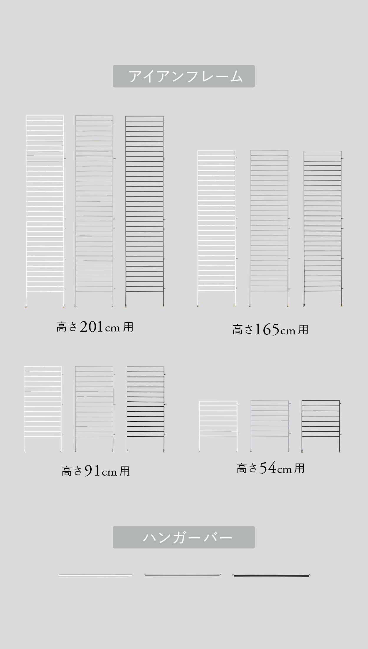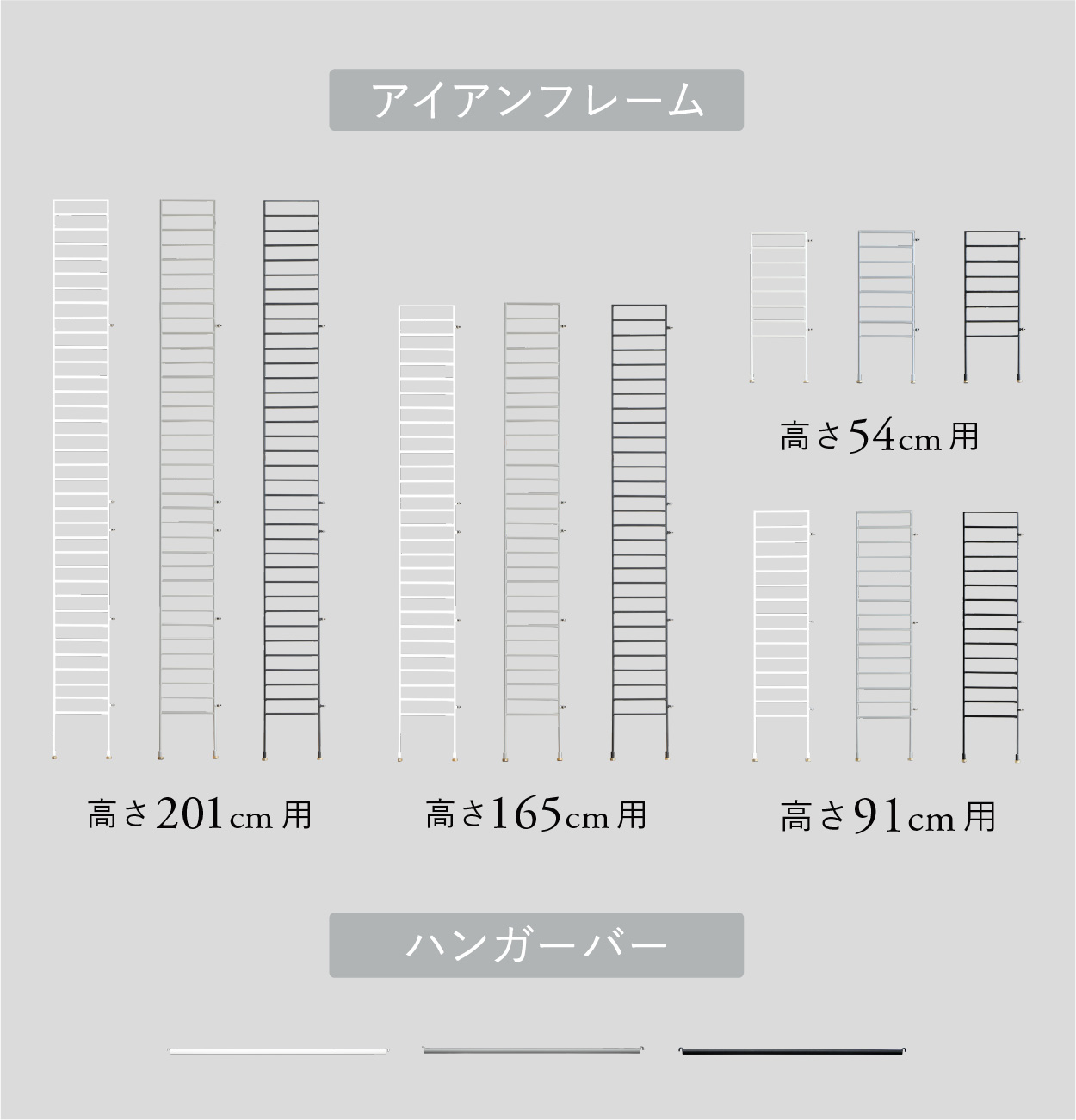 背の高い物から背の低い物までぴったり収められるよう、アイアンフレームのピッチは5cm刻みに設定。