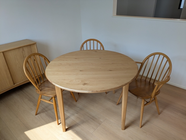 背もたれの形は迷ったんですが、ダイニングテーブルを円形のものにしていたのでそれに合わせて丸いほうにしました!かわいい、、、。部屋が可愛らしい印象になって嬉しいです。色味も写真で見る通りあたたかみがあってよかったです!リセノさんの商品の中でもかなり上位に来るくらい買ってよかったなと思います。