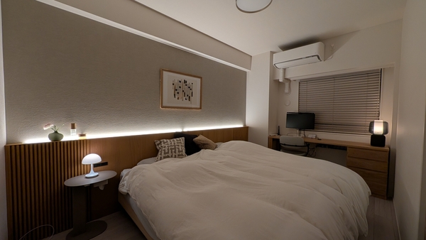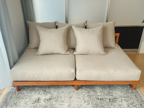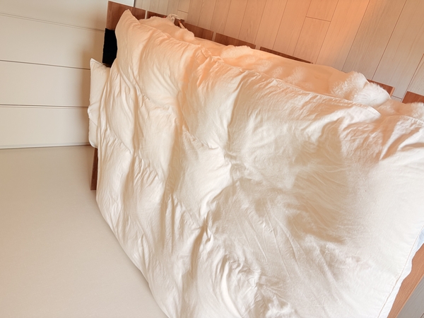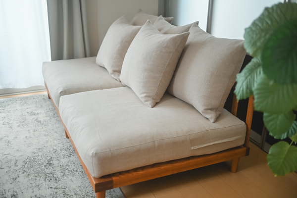リネン生地×ベージュの組み合わせで、部屋全体の印象がやわらかく落ち着いた雰囲気に。