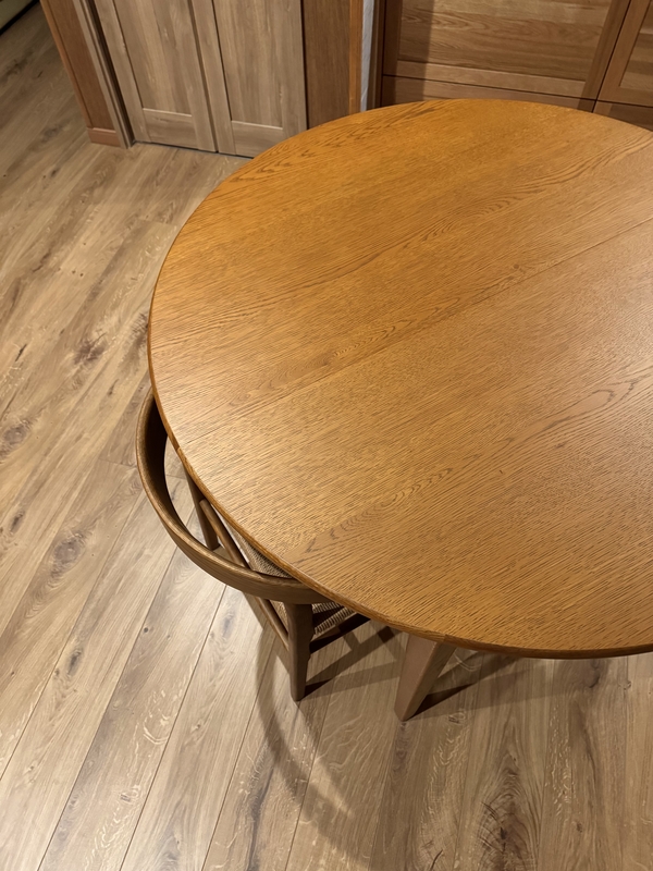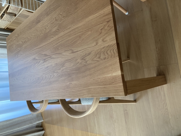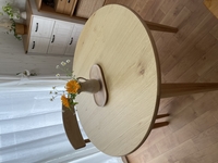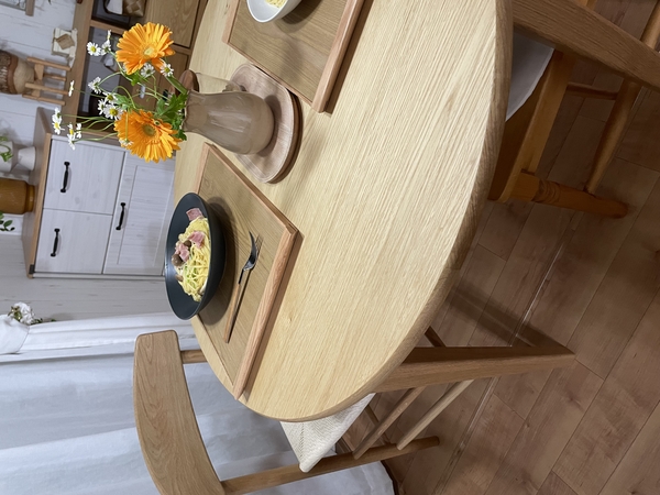 引き出し付きが便利だったので、今回も引き出し付きで、4本足、明るい色、椅子がテーブルに掛けられること、楕円(拡張ではないもの)、天板の管理が簡単なことを条件に、